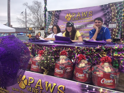 We got to help sponsor a very decorated up Mardi Gras wagon today and host our little buddy "River the Raccoon". River was featured on this years limited edition Mardi Gras tee and he has been loved by many.